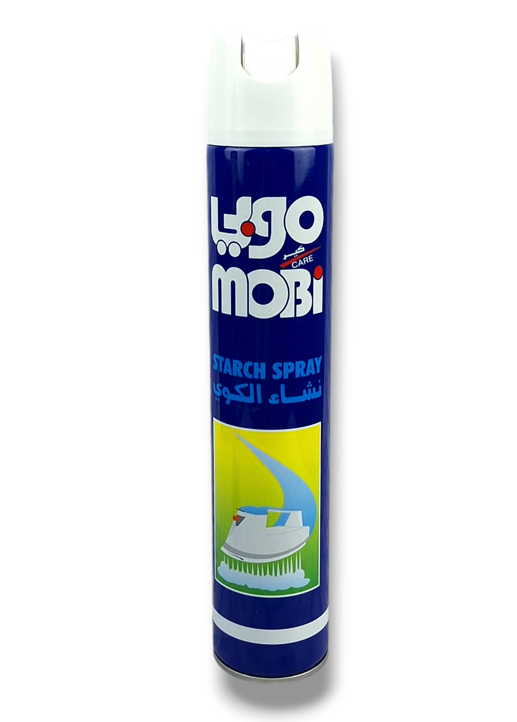 تركيبة جديدة ومحسنة لتطوير الكي. بخاخ النشا من موبي يعطي ملابسك نعومة إضافية ورائحة لطيفة