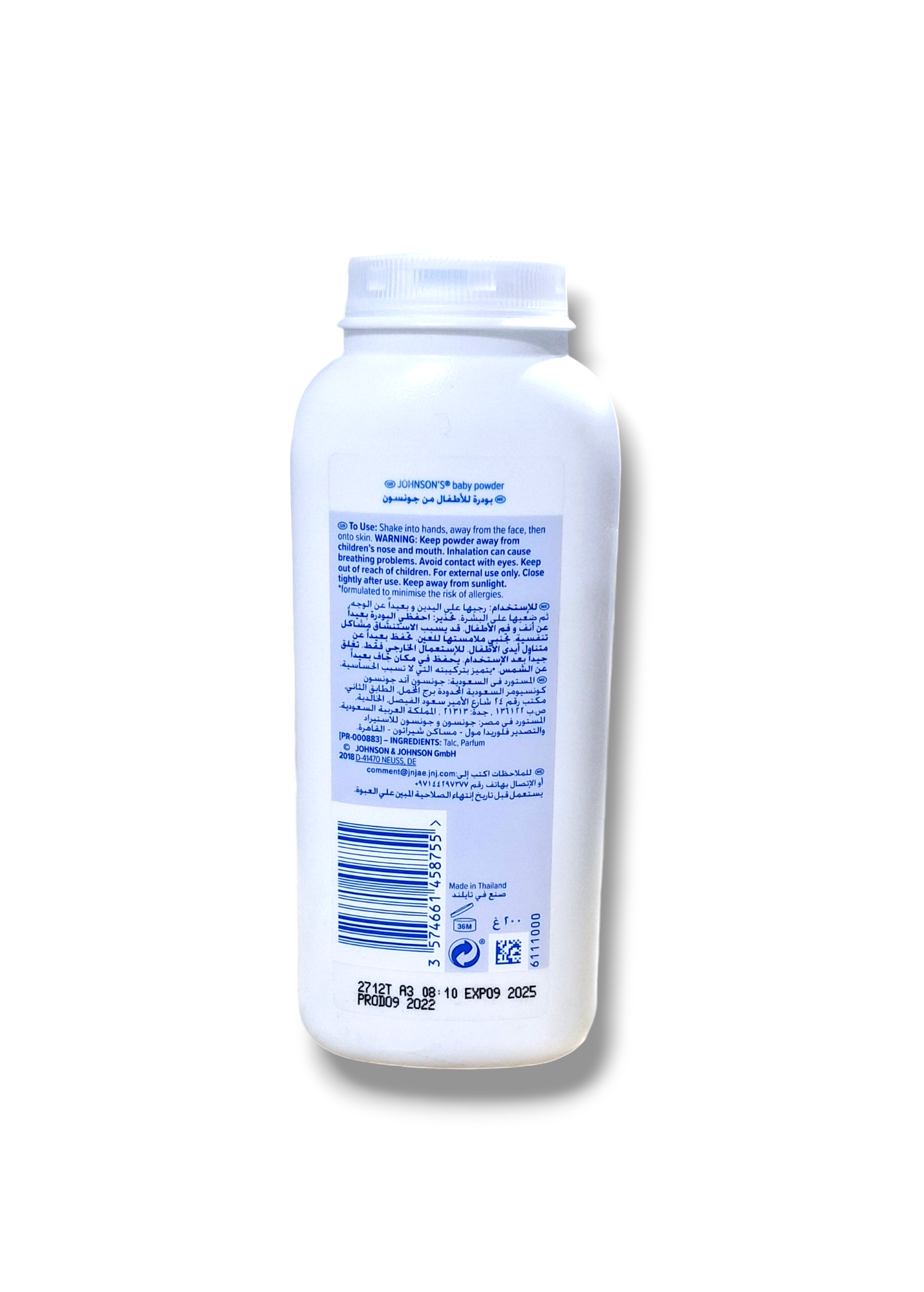 بودرة جونسون تركيبة متطورة تم اختبارها من قبل الخبراء واطباء الجلدية ● تمنح الجلد شعور منعش ومريح ● تحافظ على جفاف البشرة دون أن تسبب انسداد المسام ● منتج خالي من البارابين والكحول والصبغات ● تقي من الالتهابات الجلدية والطفح الجلدية في ايام الصيف ذات الرطوبة العالية ● لا تسبب حساسية مهما كان نوع البشرة ● مناسبة للرضع والأطفال والبالغين