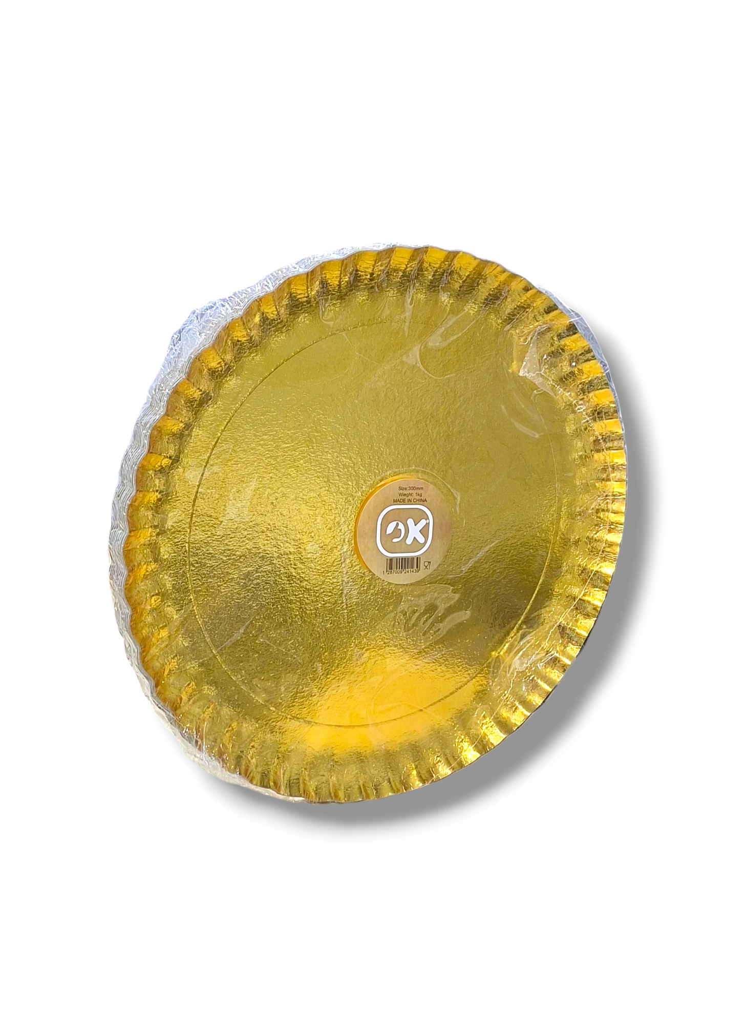 صحون ورق ذهبية بشكل دائري للكيك والحلويات بأنواعها والشكولاتة ، من الورق المقوي لاستخدامه في محلات الحلي والكيك وتسهيل تقديم الحلي في المناسبات والزواجات بشكل مميز وراقي . قطر القاعدة : 200 مم