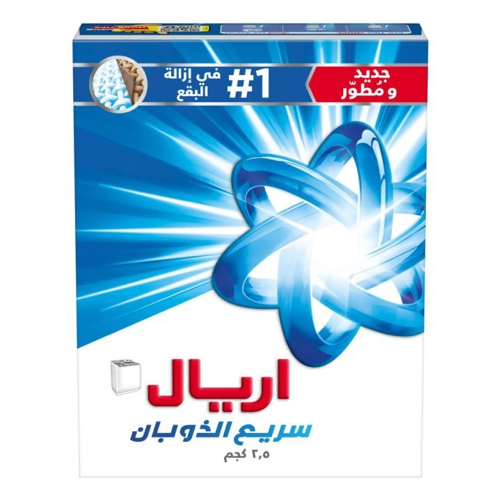 اريال تركيبة سريعة الذوبان: مصنوع ليذوب بسرعة في الغسالة. لإزالة البقع العميقة: التركيبة المحسنة تتغلغل في ألياف القماش، لتفكيك وإزالة حتى أصعب البقع بفعالية. لا يترك بقايا: مسحوق غسيل اريال سريع المفعول يشطف بسهولة دون ترك أثر. لجميع أنواع الغسيل: مناسب لمجموعة كبيرة من الأقمشة والملابس الملونة، وهذا ما يمكنه من تلبيه مختلف الاحتياجات.