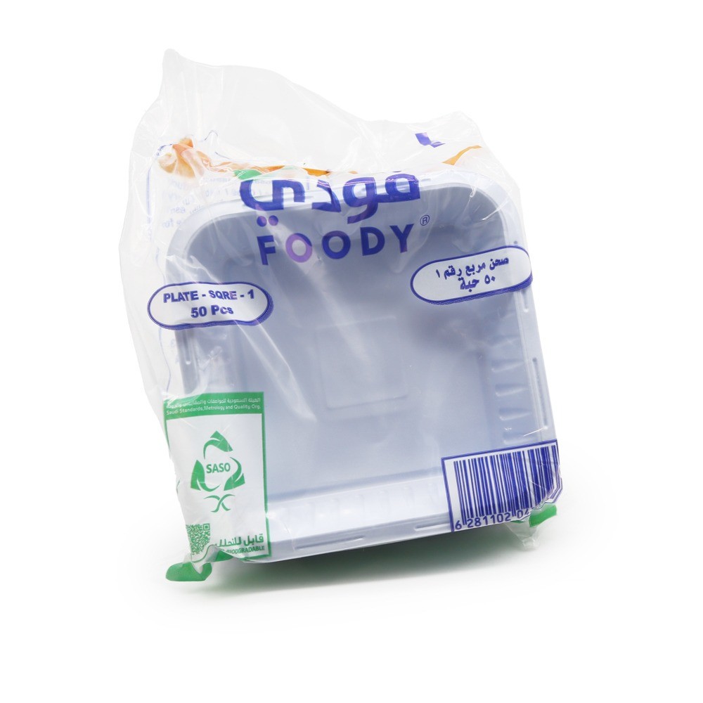 صحن بلاستيك مربع أبيض فودي رقم 1 شدة 50 حبة للعديد من الاستخدامات والتحضير السريع
