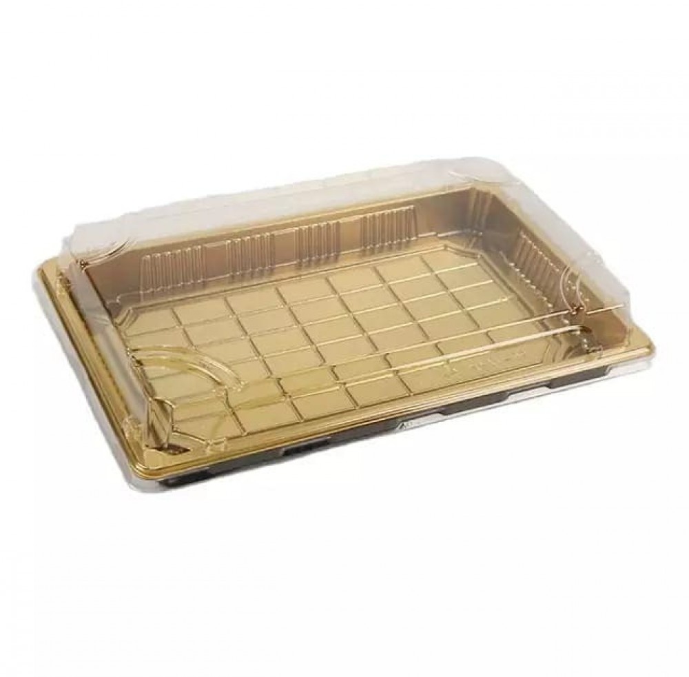 علب سوشي ذهبي مستطيل مع الغطاء الشفاف رقم 1111 شدة 50 حبة 17 * 24 سم